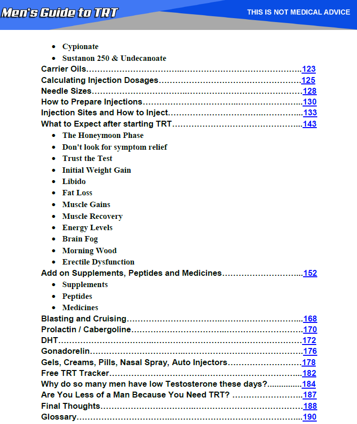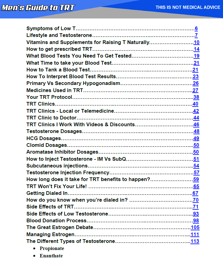 The Men's Guide to TRT is a complete guide for anyone thinking about starting TRT or who suspects they have low testosterone. It also contains tons of advanced TRT techniques and information about Medicines, Supplements, Peptides and more to help advanced users Optimize their TRT treatment.